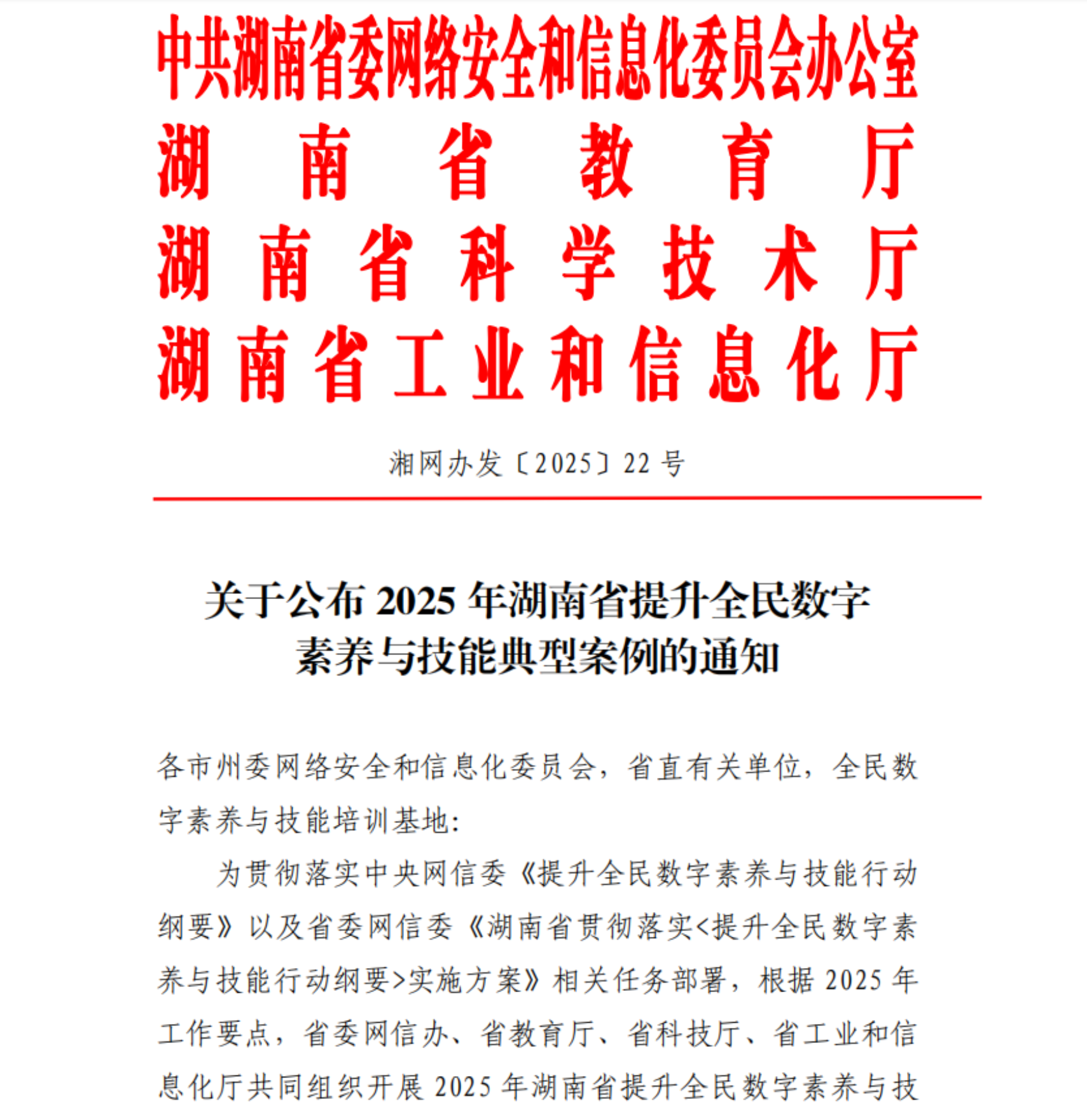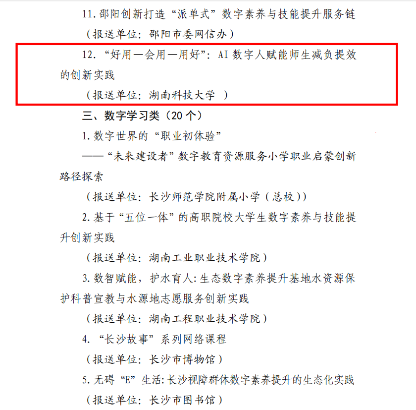 近日,中共湖南省委网信办、省教育厅、省科技厅、省工信厅联合印发《关于公布2025年湖南省提升全民数字素养与技能典型案例的通知》,我校信息化工作办公室报送的“‘好用-会用-用好’:AI数字人赋能师生减负提效的创新实践”项目获评典型案例。值得关注的是,这是我校自2023年首次斩获此项荣誉后,再次在该领域获得省级典型案例认定,充分彰显了学校在AI技术融合创新方面的持续引领成效。