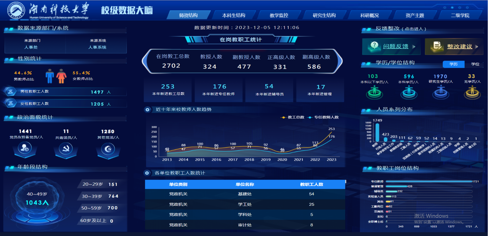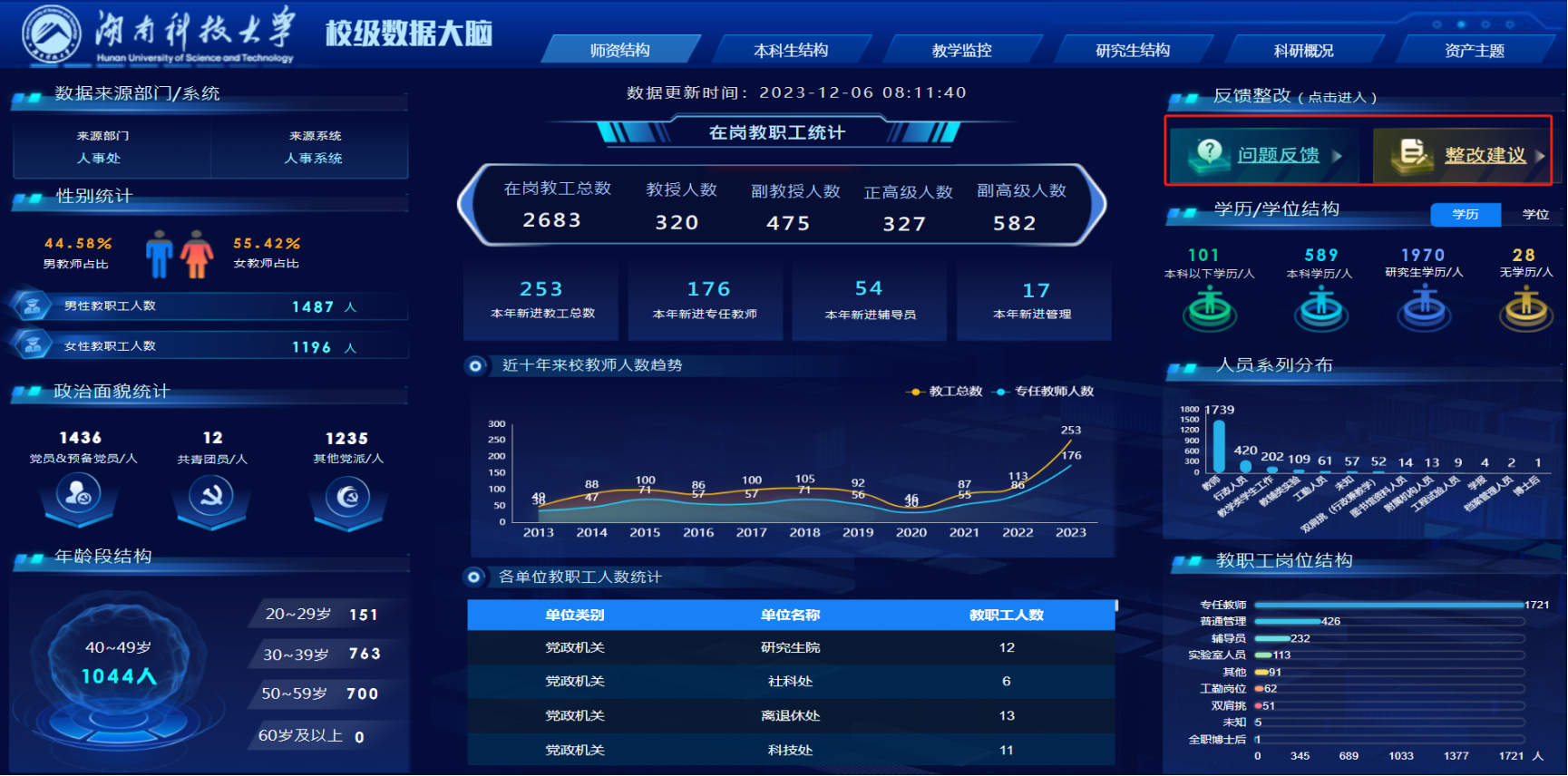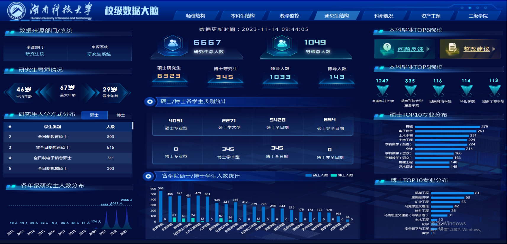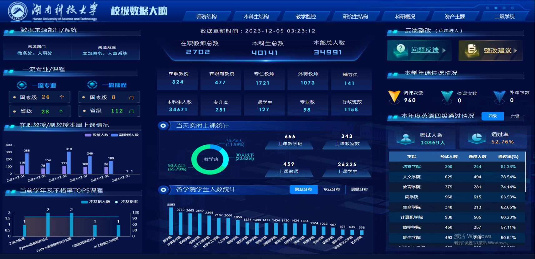 通过可视化图表对本校师生结构情况、本科教学监控、科研概况等主题以数据大屏的形式全方位呈现学校整体建设情况,实时了解校内数据,为决策分析提供支持,促进教学等工作的改进优化。